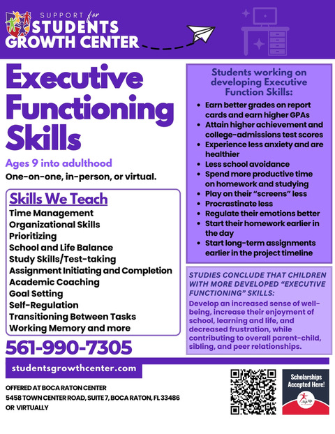 What: By direct teaching to enhance “organization skills”, “time management skills”, “critical thinking skills” and “problem solving” abilities, your child can become more teachable, flexible and adaptable to academic and life situations.