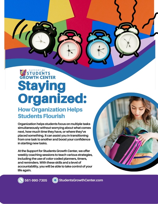 Frustration, emotional outburst, social isolation and more can all be a result of their poor organization skills because of the stress that comes with it. They may focus so much of their time on trying to figure out how to find what they lost and/or organize a task to be able to complete it properly that they do not have time for themselves or their friends. However, if they can get ahead of this issue, then they will be able to feel not only confident in whatever they are doing but, in their ability, to execute it because they know exactly how and when to do it because they organized that task properly. Keeping a planner, learning a routine, separating homework into different folders, setting reminders, and more are all things students can use and do to stay organized, and at the Support for Students Growth Center, we help teach them these skills and more to ensure they are able to not only get things organized, but keep them that way as well.